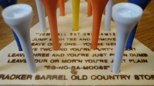 There’s plenty to look at while you wait, and the fun doesn’t stop after you’re seated. Who’s up for a challenging round of the peg game? You know the one with a triangle-shaped piece of wood featuring pegs filled with golf tees? The object is to “jump” and remove the other tees, leaving only one tee standing. It sounds more exciting than it is. But then, maybe I’m just bitter because I’ve yet to win.